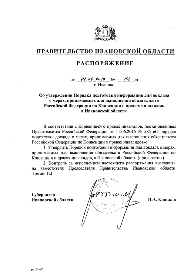 Распоряжение Правительства Ивановской области от 08.06.2017 N 108-рп "Об утверждении Порядка подготовки информации для доклада о мерах, принимаемых для выполнения обязательств Российской Федерации по Конвенции о правах инвалидов, в Ивановской области"