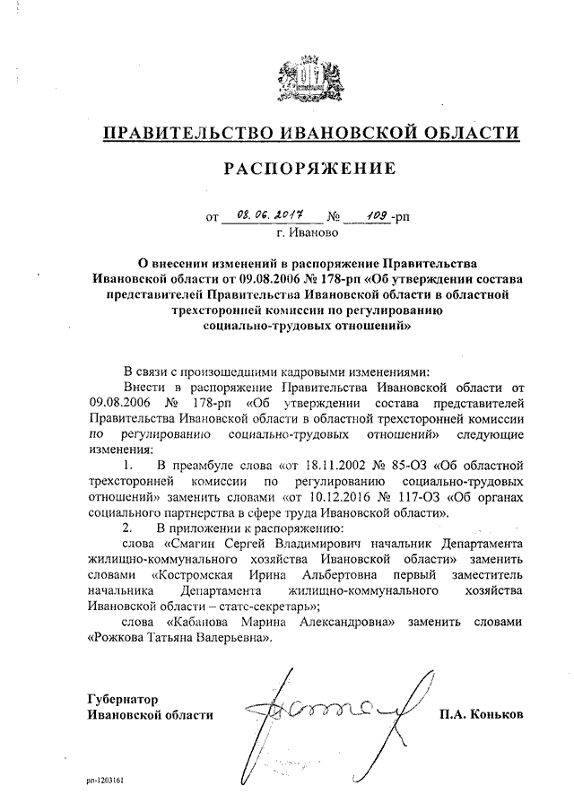 Распоряжение Правительства Ивановской области от 08.06.2017 N 109-рп "О внесении изменений в распоряжение Правительства Ивановской области от 09.08.2006 N 178-рп "Об утверждении состава представителей Правительства Ивановской области в областной трехсторонней комиссии по регулированию социально-трудовых отношений"