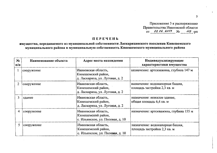 Распоряжение Правительства Ивановской области от 08.06.2017 N 113-рп "О разграничении имущества, находящегося в муниципальной собственности, между Кинешемским муниципальным районом и сельскими поселениями, входящими в его состав, в связи с изменением перечня вопросов местного значения сельского поселения"