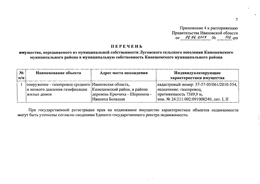 Распоряжение Правительства Ивановской области от 08.06.2017 N 113-рп "О разграничении имущества, находящегося в муниципальной собственности, между Кинешемским муниципальным районом и сельскими поселениями, входящими в его состав, в связи с изменением перечня вопросов местного значения сельского поселения"