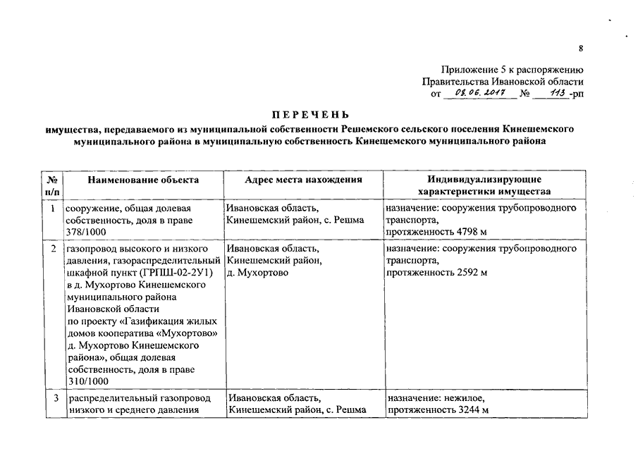 Распоряжение Правительства Ивановской области от 08.06.2017 N 113-рп "О разграничении имущества, находящегося в муниципальной собственности, между Кинешемским муниципальным районом и сельскими поселениями, входящими в его состав, в связи с изменением перечня вопросов местного значения сельского поселения"