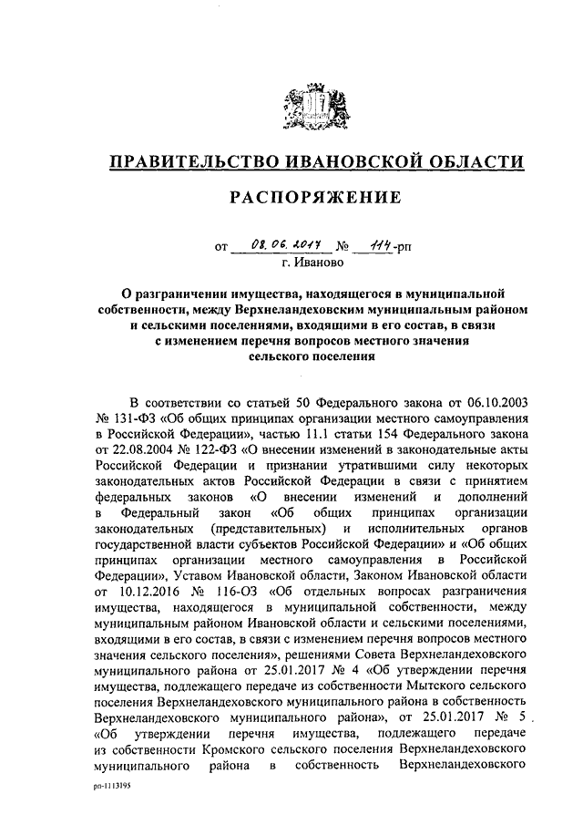 Распоряжение Правительства Ивановской области от 08.06.2017 N 114-рп "О разграничении имущества, находящегося в муниципальной собственности, между Верхнеландеховским муниципальным районом и сельскими поселениями, входящими в его состав, в связи с изменением перечня вопросов местного значения сельского поселения"