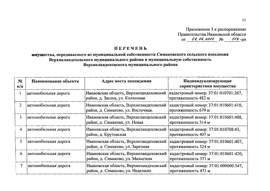 Распоряжение Правительства Ивановской области от 08.06.2017 N 114-рп "О разграничении имущества, находящегося в муниципальной собственности, между Верхнеландеховским муниципальным районом и сельскими поселениями, входящими в его состав, в связи с изменением перечня вопросов местного значения сельского поселения"