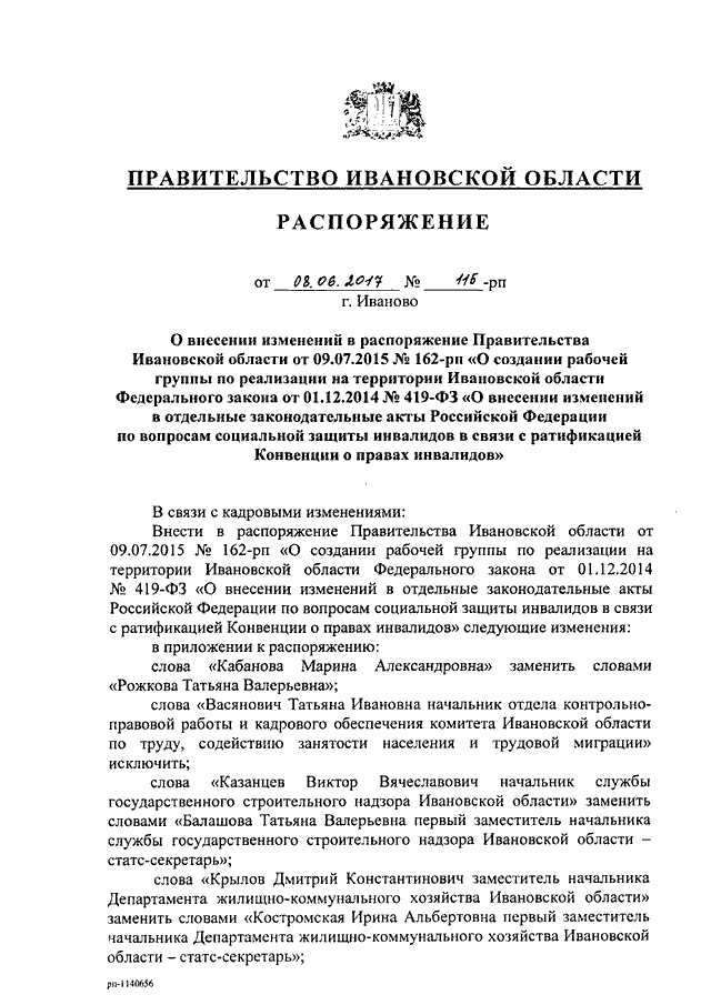 Распоряжение Правительства Ивановской области от 08.06.2017 N 115-рп "О внесении изменений в распоряжение Правительства Ивановской области от 09.07.2015 N 162-рп "О создании рабочей группы по реализации на территории Ивановской области Федерального закона от 01.12.2014 N 419-ФЗ "О внесении изменений в отдельные законодательные акты Российской Федерации по вопросам социальной защиты инвалидов в связи с ратификацией Конвенции о правах инвалидов"