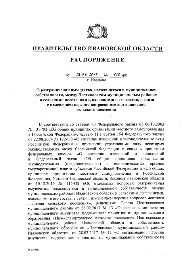 Распоряжение Правительства Ивановской области от 08.06.2017 N 116-рп "О разграничении имущества, находящегося в муниципальной собственности, между Пестяковским муниципальным районом и сельскими поселениями, входящими в его состав, в связи с изменением перечня вопросов местного значения сельского поселения"