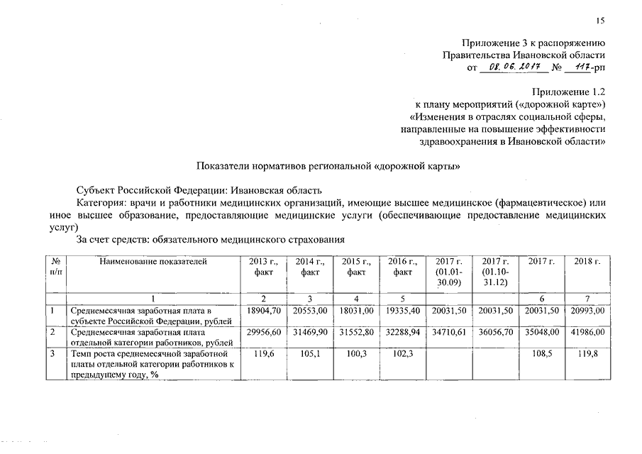 Распоряжение Правительства Ивановской области от 08.06.2017 N 117-рп "О внесении изменений в распоряжение Правительства Ивановской области от 04.03.2013 N 37-рп "Об утверждении плана мероприятий ("дорожной карты") "Изменения в отраслях социальной сферы, направленные на повышение эффективности здравоохранения в Ивановской области"