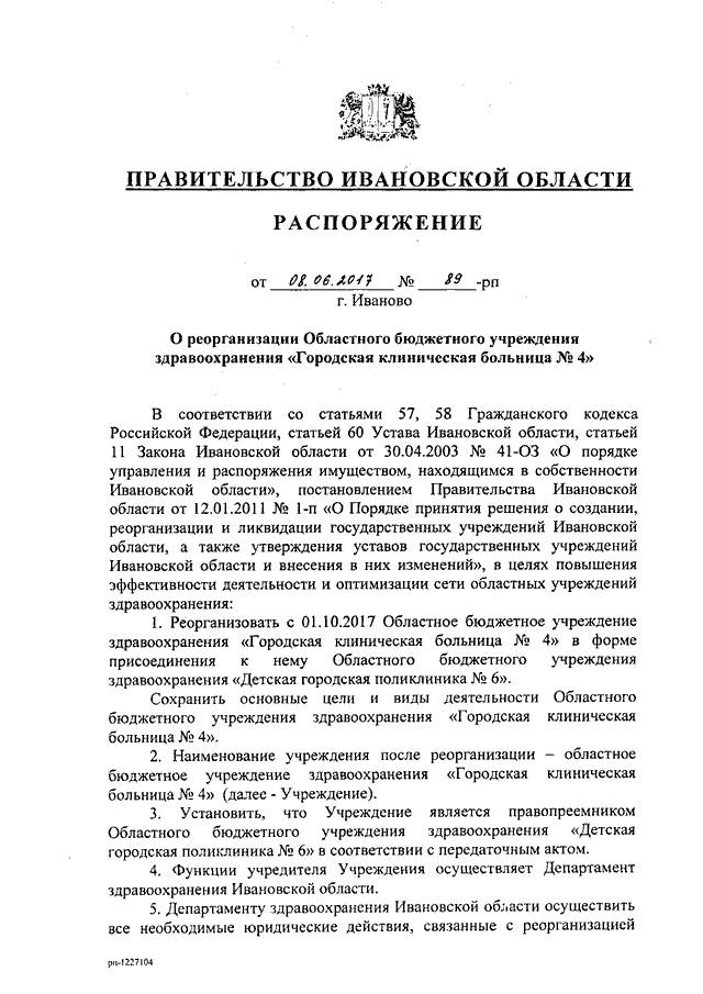 Распоряжение Правительства Ивановской области от 08.06.2017 N 89-рп "О реорганизации Областного бюджетного учреждения здравоохранения "Городская клиническая больница N 4"