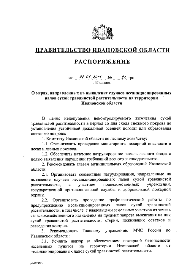 Распоряжение Правительства Ивановской области от 08.06.2017 N 92-рп "О мерах, направленных на выявление случаев несанкционированных палов сухой травянистой растительности на территории Ивановской области"