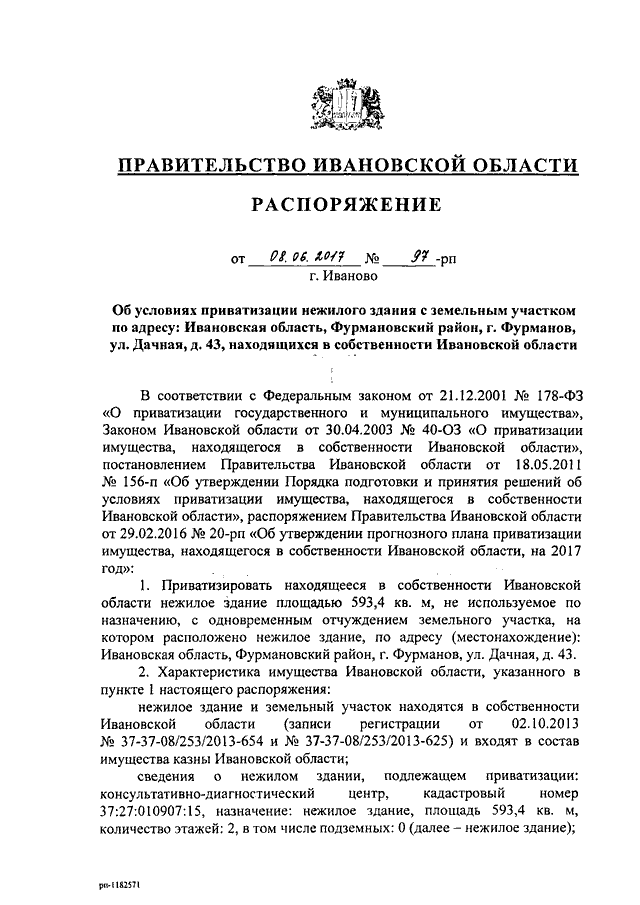 Распоряжение Правительства Ивановской области от 08.06.2017 N 97-рп "Об условиях приватизации нежилого здания с земельным участком по адресу: Ивановская область, Фурмановский район, г. Фурманов, ул. Дачная, д. 43, находящихся в собственности Ивановской области"