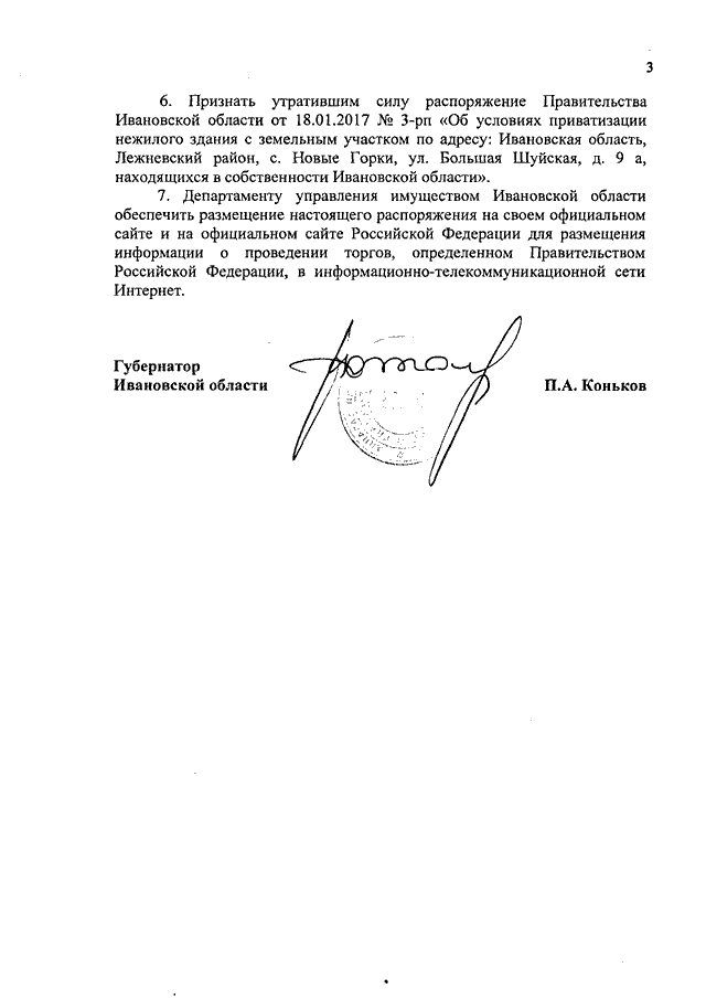 Распоряжение Правительства Ивановской области от 08.06.2017 N 98-рп "Об условиях приватизации нежилого здания с земельным участком по адресу: Ивановская область, Лежневский район, с. Новые Горки, ул. Большая Шуйская, д. 9а, находящихся в собственности Ивановской области"
