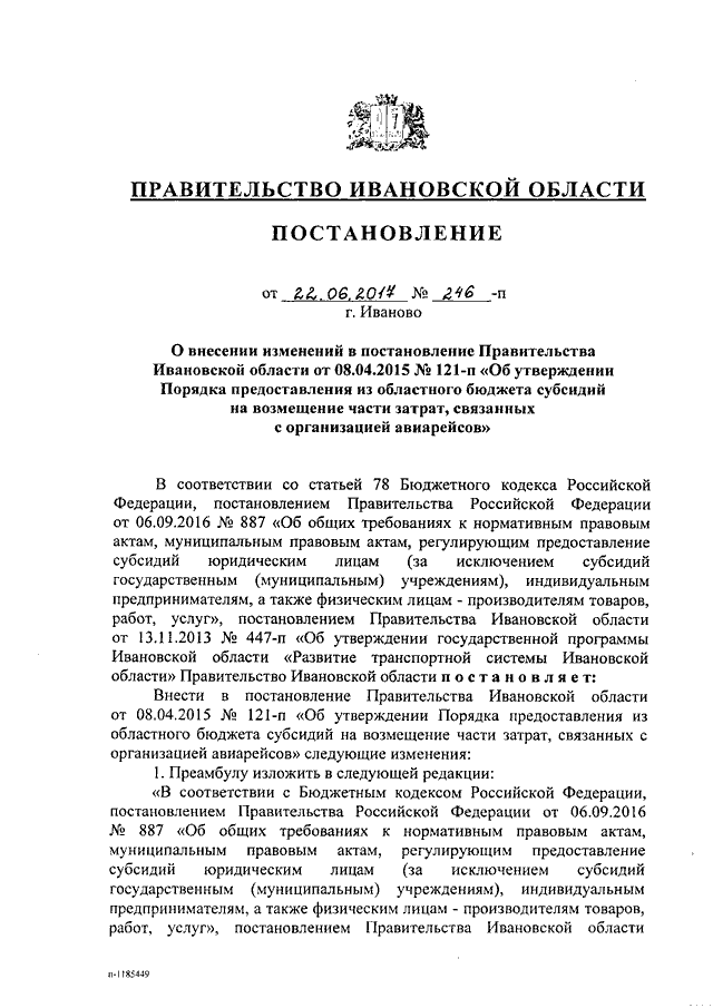 Постановление Правительства Ивановской области от 22.06.2017 N 246-п "О внесении изменений в постановление Правительства Ивановской области от 08.04.2015 N 121-п "Об утверждении Порядка предоставления из областного бюджета субсидий на возмещение части затрат, связанных с организацией авиарейсов"