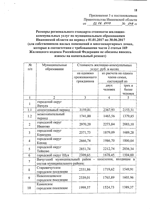 Постановление Правительства Ивановской области от 23.06.2017 N 249-п "Об установлении размеров региональных стандартов стоимости жилищно-коммунальных услуг"