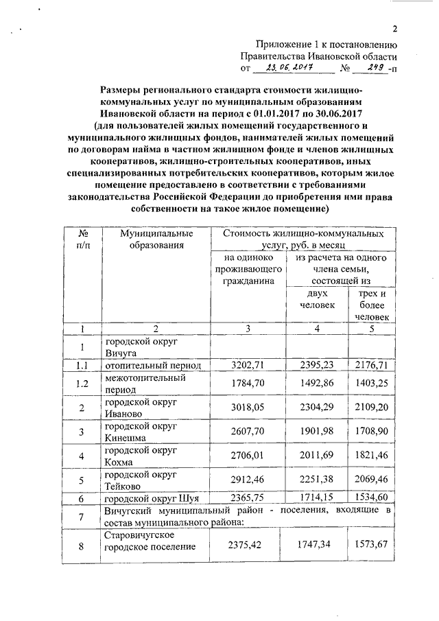 Постановление Правительства Ивановской области от 23.06.2017 N 249-п "Об установлении размеров региональных стандартов стоимости жилищно-коммунальных услуг"