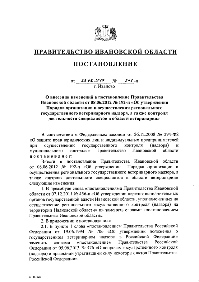 Постановление Правительства Ивановской области от 23.06.2017 N 248-п "О внесении изменений в постановление Правительства Ивановской области от 08.06.2012 N 192-п "Об утверждении Порядка организации и осуществления регионального государственного ветеринарного надзора, а также контроля деятельности специалистов в области ветеринарии"