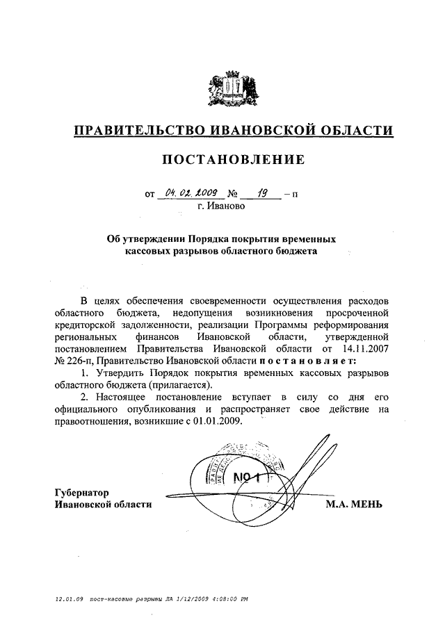 Постановление Правительства Ивановской области от 04.02.2009 N 19-п "Об утверждении Порядка покрытия временных кассовых разрывов областного бюджета"