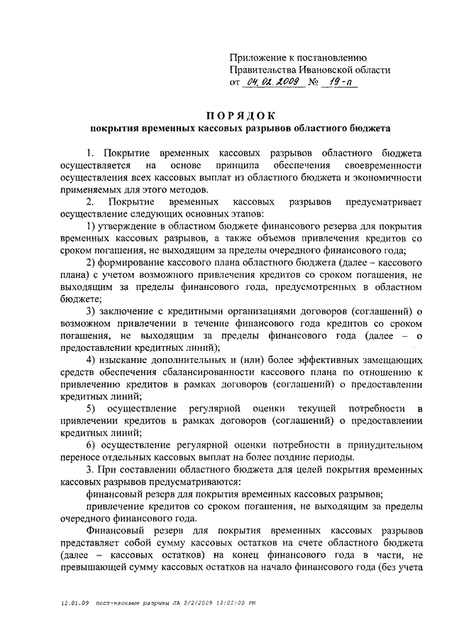 Постановление Правительства Ивановской области от 04.02.2009 N 19-п "Об утверждении Порядка покрытия временных кассовых разрывов областного бюджета"