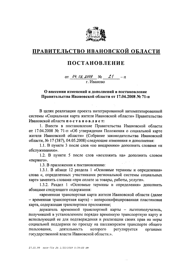 Постановление Правительства Ивановской области от 04.02.2009 N 21-п "О внесении изменений и дополнений в постановление Правительства Ивановской области от 17.04.2008 N 71-п"