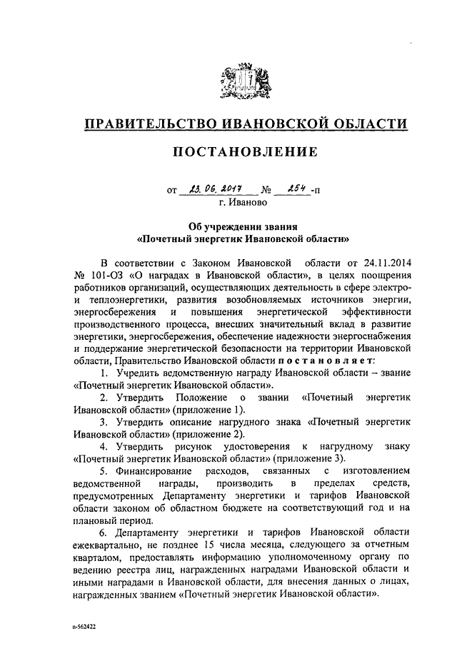 Постановление Правительства Ивановской области от 23.06.2017 N 254-п "Об учреждении звания "Почетный энергетик Ивановской области" (вместе с "Положением о звании "Почетный энергетик Ивановской области")