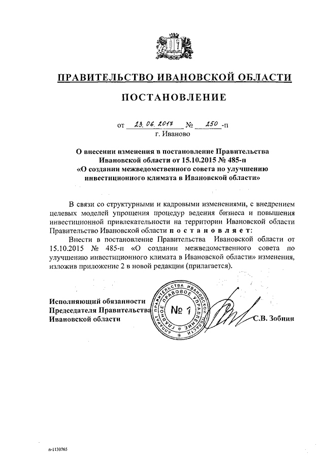 Постановление Правительства Ивановской области от 23.06.2017 N 250-п "О внесении изменения в постановление Правительства Ивановской области от 15.10.2015 N 485-п "О создании межведомственного совета по улучшению инвестиционного климата в Ивановской области"