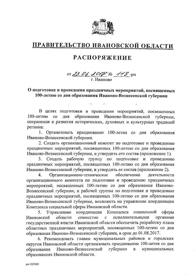 Распоряжение Правительства Ивановской области от 23.06.2017 N 118-рп "О подготовке и проведении праздничных мероприятий, посвященных 100-летию со дня образования Иваново-Вознесенской губернии"