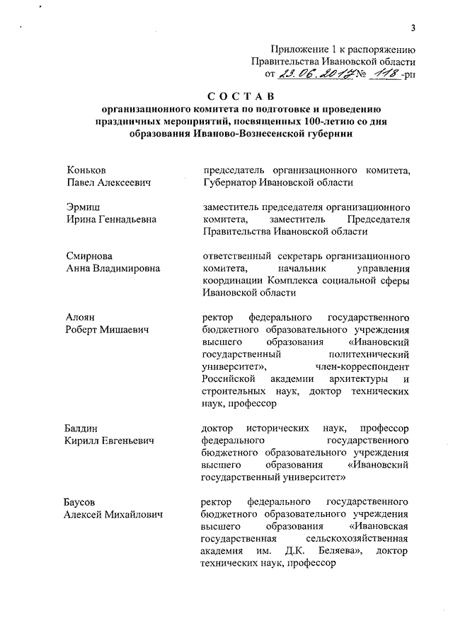 Распоряжение Правительства Ивановской области от 23.06.2017 N 118-рп "О подготовке и проведении праздничных мероприятий, посвященных 100-летию со дня образования Иваново-Вознесенской губернии"