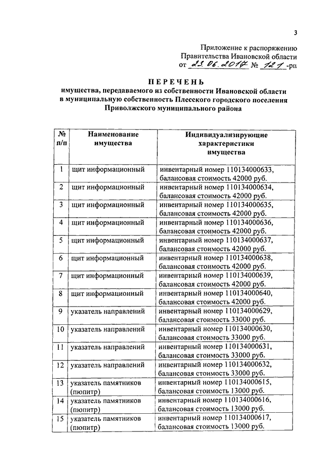 Распоряжение Правительства Ивановской области от 23.06.2017 N 121-рп "О передаче рекламно-информационных объектов из собственности Ивановской области в муниципальную собственность Плесского городского поселения Приволжского муниципального района"