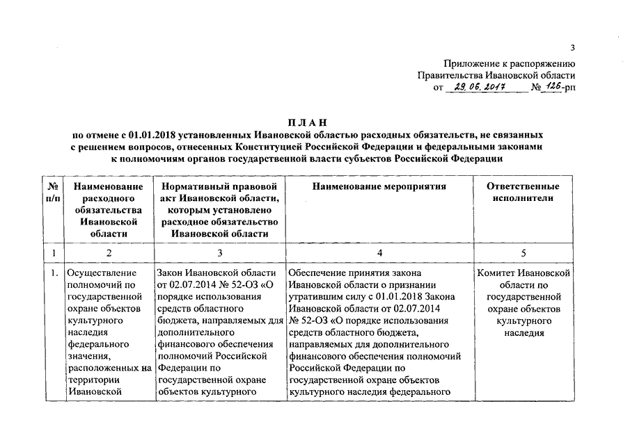 Распоряжение Правительства Ивановской области от 29.06.2017 N 126-рп "О плане по отмене с 01.01.2018 установленных Ивановской областью расходных обязательств, не связанных с решением вопросов, отнесенных Конституцией Российской Федерации и федеральными законами к полномочиям органов государственной власти субъектов Российской Федерации"