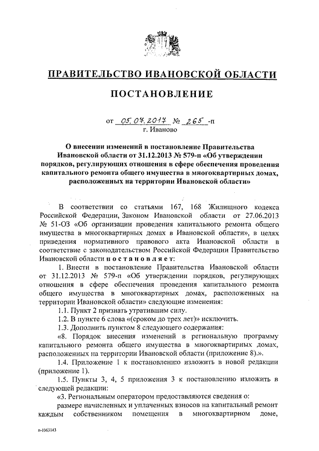 Постановление Правительства Ивановской области от 05.07.2017 N 265-п "О внесении изменений в постановление Правительства Ивановской области от 31.12.2013 N 579-п "Об утверждении порядков, регулирующих отношения в сфере обеспечения проведения капитального ремонта общего имущества в многоквартирных домах, расположенных на территории Ивановской области" (вместе с "Порядком проведения мониторинга технического состояния многоквартирных домов, расположенных на территории Ивановской области", "Порядком утверждения краткосрочных планов реализации региональной программы капитального ремонта общего имущества в многоквартирных домах", "Порядком внесения изменений в региональную программу капитального ремонта общего имущества в многоквартирных домах, расположенных на территории Ивановской области")