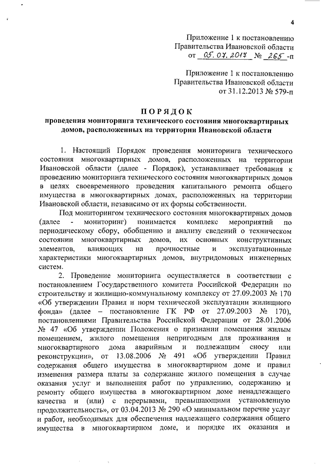 Постановление Правительства Ивановской области от 05.07.2017 N 265-п "О внесении изменений в постановление Правительства Ивановской области от 31.12.2013 N 579-п "Об утверждении порядков, регулирующих отношения в сфере обеспечения проведения капитального ремонта общего имущества в многоквартирных домах, расположенных на территории Ивановской области" (вместе с "Порядком проведения мониторинга технического состояния многоквартирных домов, расположенных на территории Ивановской области", "Порядком утверждения краткосрочных планов реализации региональной программы капитального ремонта общего имущества в многоквартирных домах", "Порядком внесения изменений в региональную программу капитального ремонта общего имущества в многоквартирных домах, расположенных на территории Ивановской области")