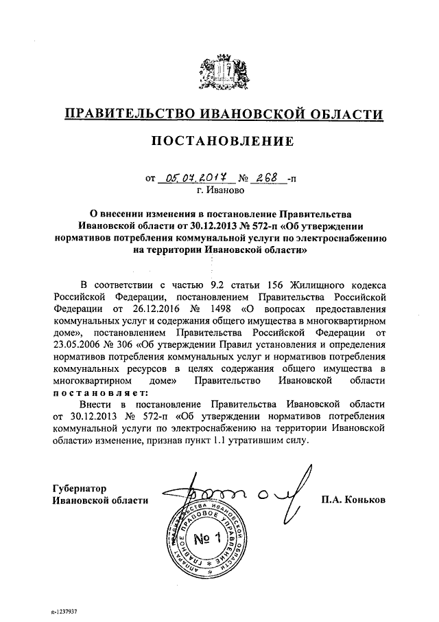 Постановление Правительства Ивановской области от 05.07.2017 N 268-п "О внесении изменения в постановление Правительства Ивановской области от 30.12.2013 N 572-п "Об утверждении нормативов потребления коммунальной услуги по электроснабжению на территории Ивановской области"