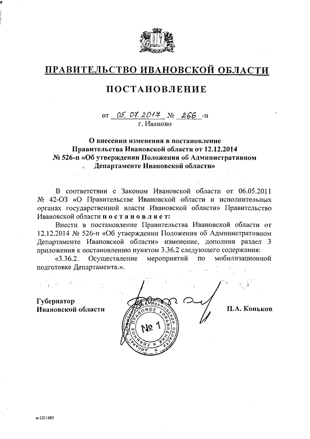 Постановление Правительства Ивановской области от 05.07.2017 N 266-п "О внесении изменения в постановление Правительства Ивановской области от 12.12.2014 N 526-п "Об утверждении Положения об Административном Департаменте Ивановской области"