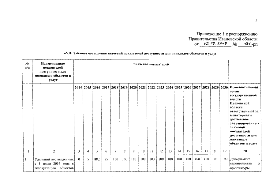 Распоряжение Правительства Ивановской области от 05.07.2017 N 131-рп "О внесении изменений в распоряжение Правительства Ивановской области от 17.12.2015 N 286-рп "Об утверждении плана мероприятий ("дорожной карты") по повышению значений показателей доступности для инвалидов объектов и предоставляемых в них услуг в Ивановской области"