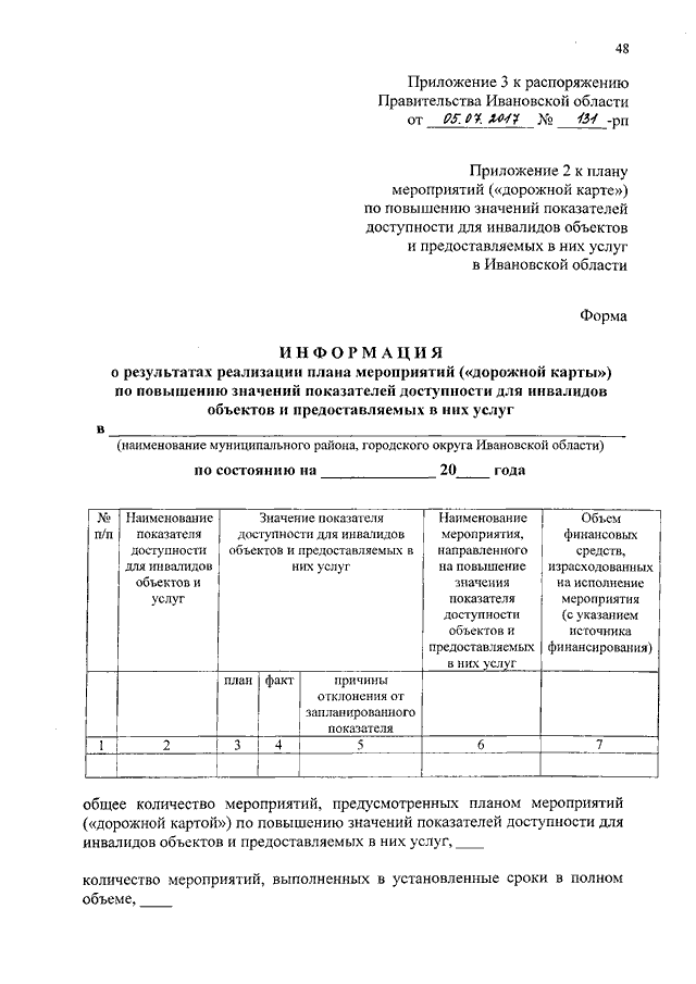 Распоряжение Правительства Ивановской области от 05.07.2017 N 131-рп "О внесении изменений в распоряжение Правительства Ивановской области от 17.12.2015 N 286-рп "Об утверждении плана мероприятий ("дорожной карты") по повышению значений показателей доступности для инвалидов объектов и предоставляемых в них услуг в Ивановской области"