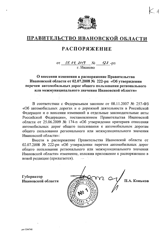 Распоряжение Правительства Ивановской области от 05.07.2017 N 128-рп "О внесении изменения в распоряжение Правительства Ивановской области от 02.07.2008 N 222-рп "Об утверждении перечня автомобильных дорог общего пользования регионального или межмуниципального значения Ивановской области"