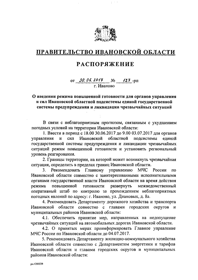 Распоряжение Правительства Ивановской области от 30.06.2017 N 127-рп "О введении режима повышенной готовности для органов управления и сил Ивановской областной подсистемы единой государственной системы предупреждения и ликвидации чрезвычайных ситуаций"