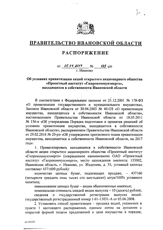 Распоряжение Правительства Ивановской области от 05.07.2017 N 129-рп "Об условиях приватизации акций открытого акционерного общества "Проектный институт "Гипрокоммунэнерго", находящихся в собственности Ивановской области"