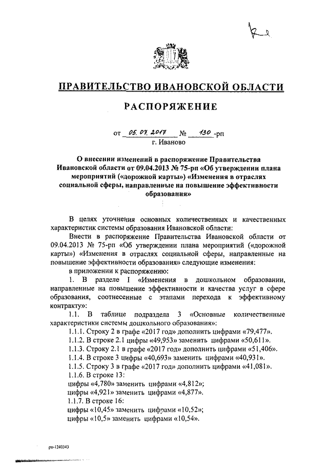 Распоряжение Правительства Ивановской области от 05.07.2017 N 130-рп "О внесении изменений в распоряжение Правительства Ивановской области от 09.04.2013 N 75-рп "Об утверждении плана мероприятий ("дорожной карты") "Изменения в отраслях социальной сферы, направленные на повышение эффективности образования"