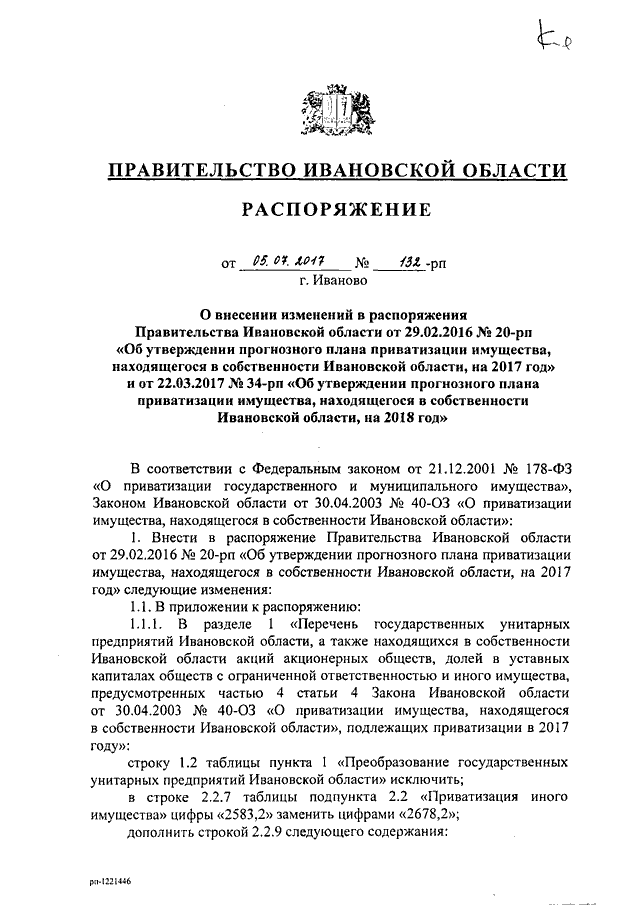 Распоряжение Правительства Ивановской области от 05.07.2017 N 132-рп "О внесении изменений в распоряжения Правительства Ивановской области от 29.02.2016 N 20-рп "Об утверждении прогнозного плана приватизации имущества, находящегося в собственности Ивановской области, на 2017 год" и от 22.03.2017 N 34-рп "Об утверждении прогнозного плана приватизации имущества, находящегося в собственности Ивановской области, на 2018 год"