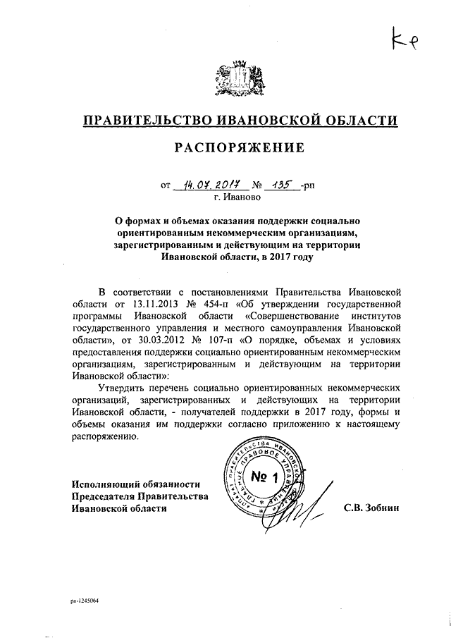 Распоряжение Правительства Ивановской области от 14.07.2017 N 135-рп "О формах и объемах оказания поддержки социально ориентированным некоммерческим организациям, зарегистрированным и действующим на территории Ивановской области, в 2017 году" (вместе с "Перечнем социально ориентированных некоммерческих организаций, зарегистрированных и действующих на территории Ивановской области, - получателей поддержки в 2017 году, формами и объемами оказания им поддержки")