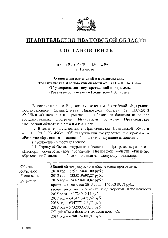 Постановление Правительства Ивановской области от 17.07.2017 N 274-п "О внесении изменений в постановление Правительства Ивановской области от 13.11.2013 N 450-п "Об утверждении государственной программы "Развитие образования Ивановской области"