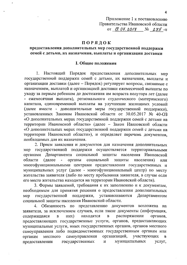 Постановление Правительства Ивановской области от 19.07.2017 N 275-п "О реализации Закона Ивановской области от 30.05.2017 N 40-ОЗ "О дополнительных мерах государственной поддержки семей с детьми на территории Ивановской области" и внесении изменений в некоторые постановления Правительства Ивановской области" (вместе с "Порядком предоставления дополнительных мер государственной поддержки семей с детьми, их назначения, выплаты и организации доставки", "Порядком учета и исчисления величины среднедушевого дохода семьи, дающего право на получение ежемесячной выплаты по уходу за первым ребенком до достижения им возраста полутора лет и регионального студенческого (материнского) капитала", "Порядком предоставления, расходования и учета средств, выделенных из областного бюджета на выплату дополнительных мер государственной поддержки семей с детьми")