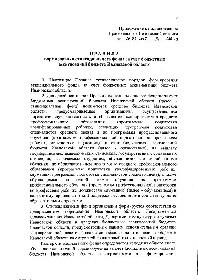 Постановление Правительства Ивановской области от 20.07.2017 N 286-п "Об утверждении Правил формирования стипендиального фонда за счет бюджетных ассигнований бюджета Ивановской области"