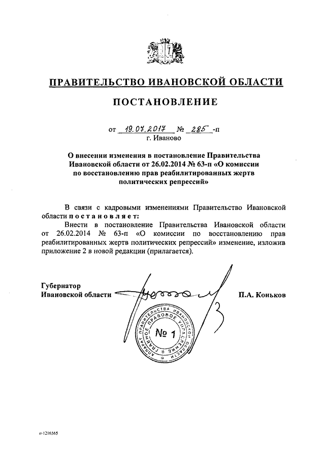 Постановление Правительства Ивановской области от 19.07.2017 N 285-п "О внесении изменения в постановление Правительства Ивановской области от 26.02.2014 N 63-п "О комиссии по восстановлению прав реабилитированных жертв политических репрессий"