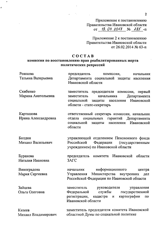 Постановление Правительства Ивановской области от 19.07.2017 N 285-п "О внесении изменения в постановление Правительства Ивановской области от 26.02.2014 N 63-п "О комиссии по восстановлению прав реабилитированных жертв политических репрессий"