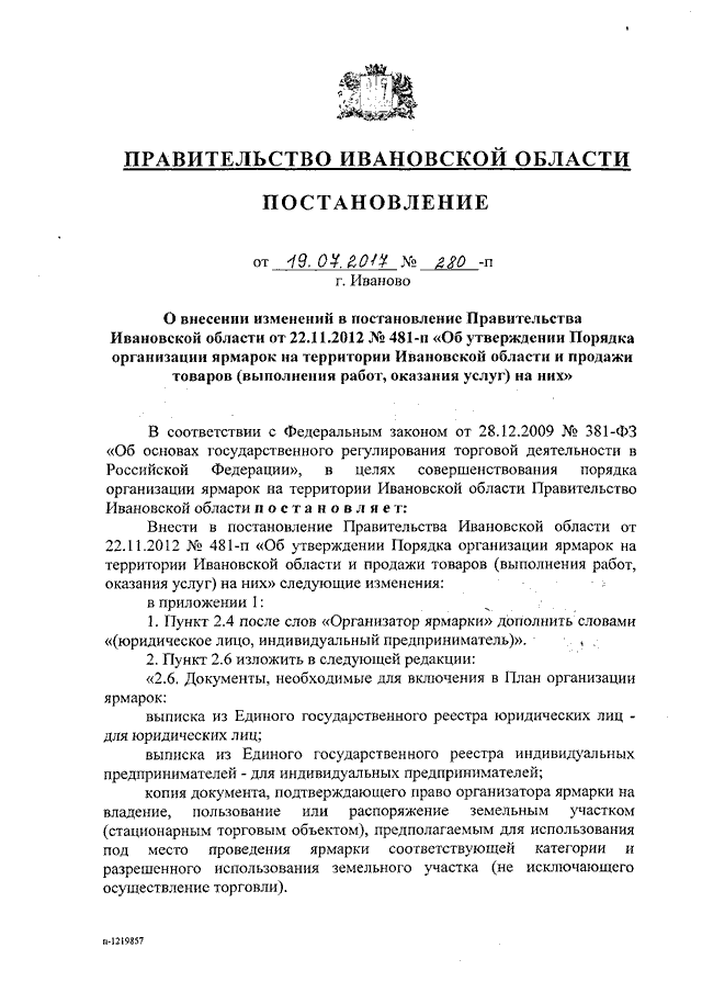 Постановление Правительства Ивановской области от 19.07.2017 N 280-п "О внесении изменений в постановление Правительства Ивановской области от 22.11.2012 N 481-п "Об утверждении Порядка организации ярмарок на территории Ивановской области и продажи товаров (выполнения работ, оказания услуг) на них"