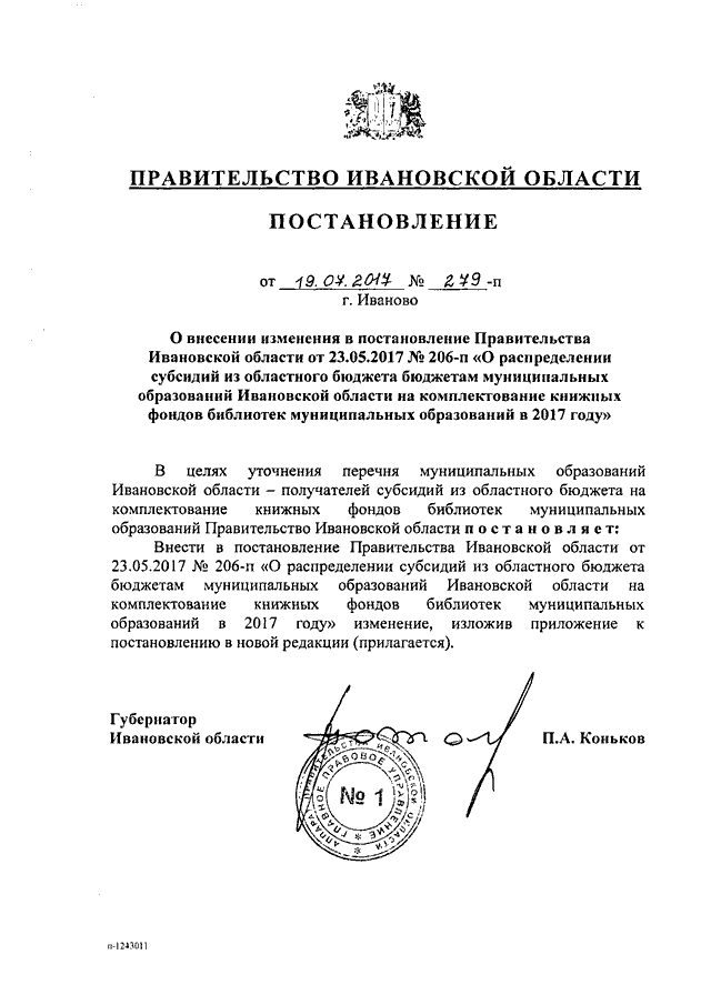 Постановление Правительства Ивановской области от 19.07.2017 N 279-п "О внесении изменения в постановление Правительства Ивановской области от 23.05.2017 N 206-п "О распределении субсидий из областного бюджета бюджетам муниципальных образований Ивановской области на комплектование книжных фондов библиотек муниципальных образований в 2017 году"