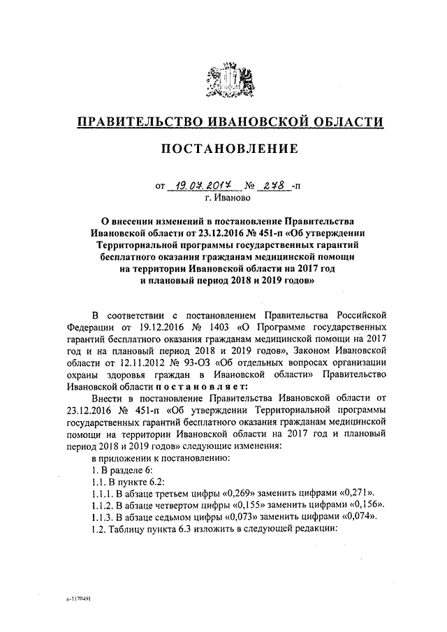 Постановление Правительства Ивановской области от 19.07.2017 N 278-п "О внесении изменений в постановление Правительства Ивановской области от 23.12.2016 N 451-п "Об утверждении Территориальной программы государственных гарантий бесплатного оказания гражданам медицинской помощи на территории Ивановской области на 2017 год и плановый период 2018 и 2019 годов"