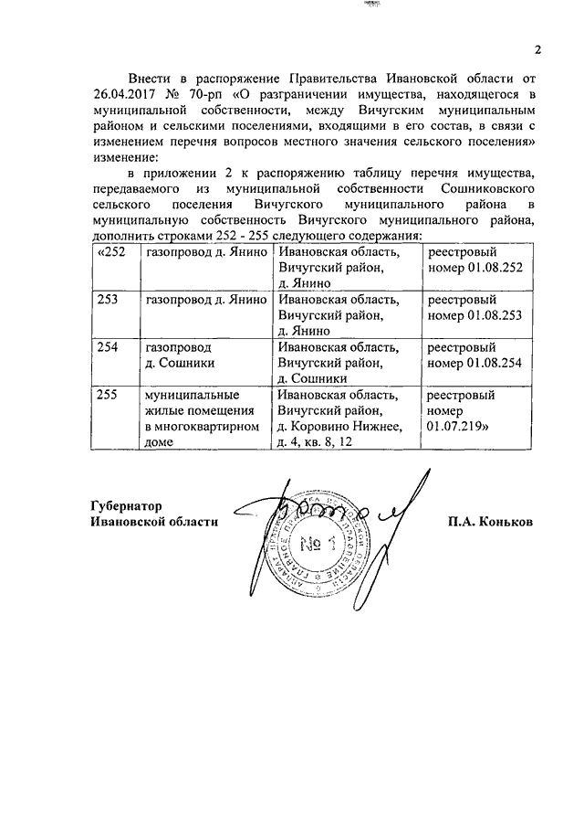Распоряжение Правительства Ивановской области от 19.07.2017 N 137-рп "О внесении изменения в распоряжение Правительства Ивановской области от 26.04.2017 N 70-рп "О разграничении имущества, находящегося в муниципальной собственности, между Вичугским муниципальным районом и сельскими поселениями, входящими в его состав, в связи с изменением перечня вопросов местного значения сельского поселения"