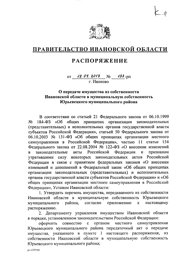 Распоряжение Правительства Ивановской области от 19.07.2017 N 138-рп "О передаче имущества из собственности Ивановской области в муниципальную собственность Юрьевецкого муниципального района"
