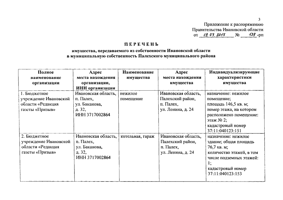 Распоряжение Правительства Ивановской области от 19.07.2017 N 139-рп "О передаче имущества из собственности Ивановской области в муниципальную собственность Палехского муниципального района"